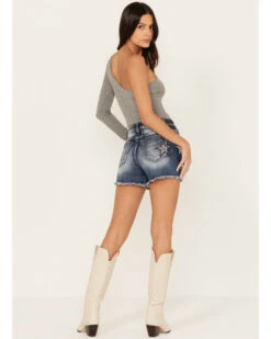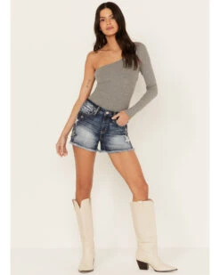Miss Me Women’s Dark Wash High Rise Star Paisley Patch Print Frayed Shorts