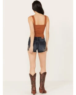 Shyanne Women’s Dark Medium Wash Mid Rise Embroidered Stretch Denim Shorts