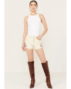 Shyanne Women’s Dark Medium Wash Mid Rise Embroidered Stretch Denim Shorts